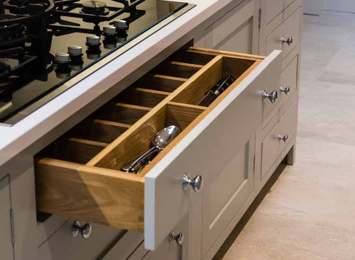 All of our drawers are made with solid oak and have real dovetail joints at the front and the back for extra strength. Hidden soft close runners are standard.