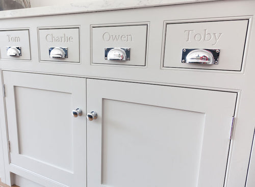 Lots of our cabinets have the option to use engraved words of your choice. Whether its a tall larder with engraving at the top or a treat drawer for each member of the family.